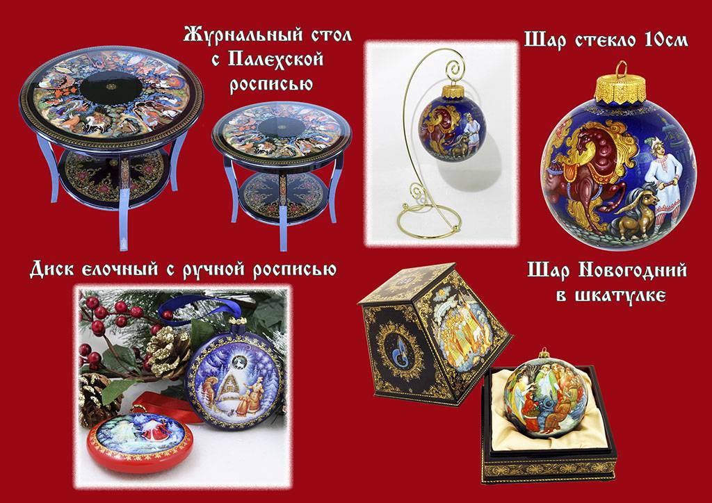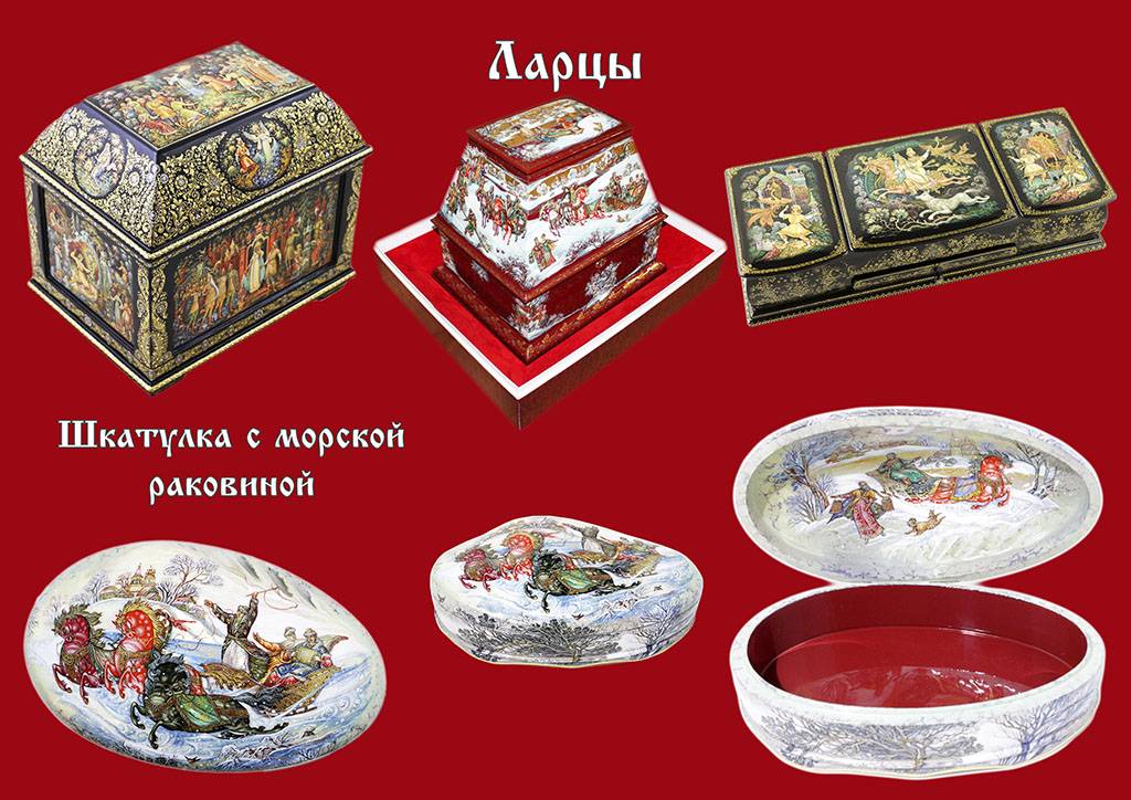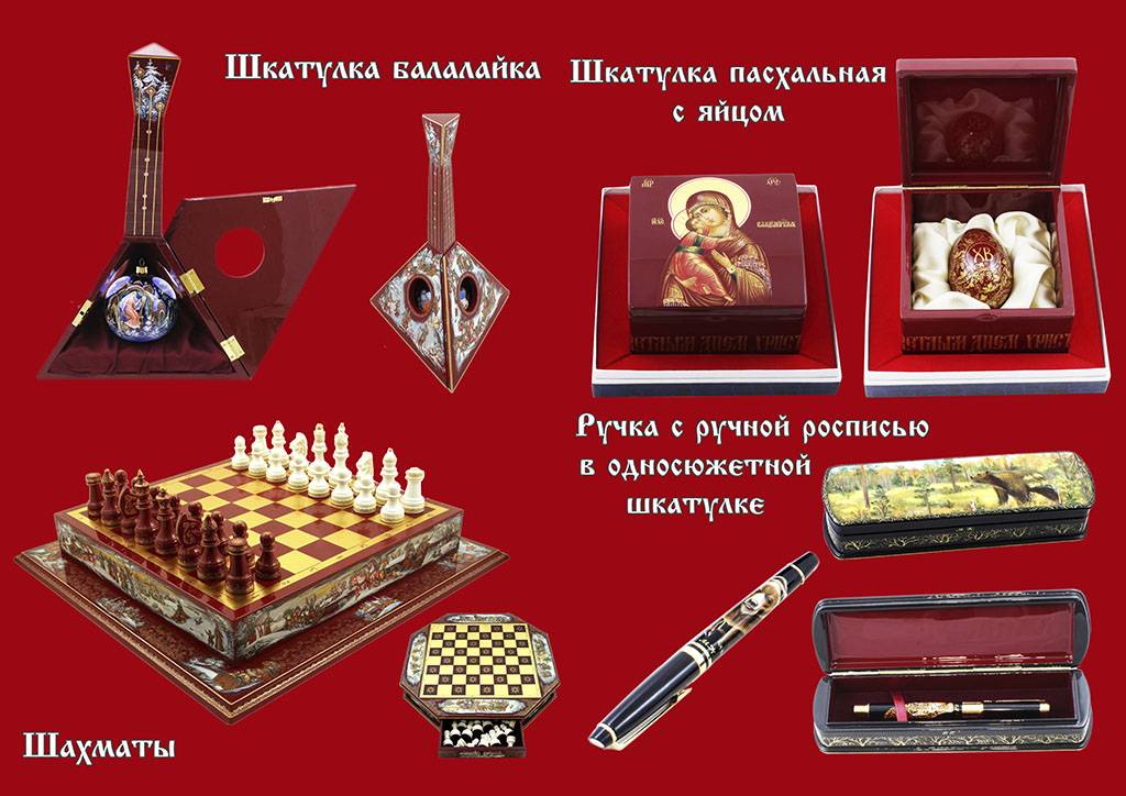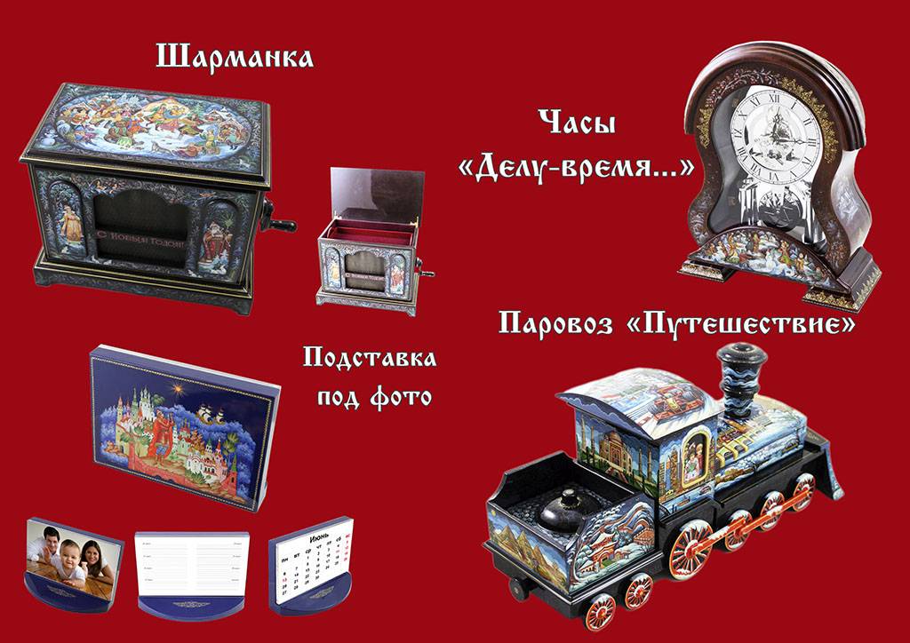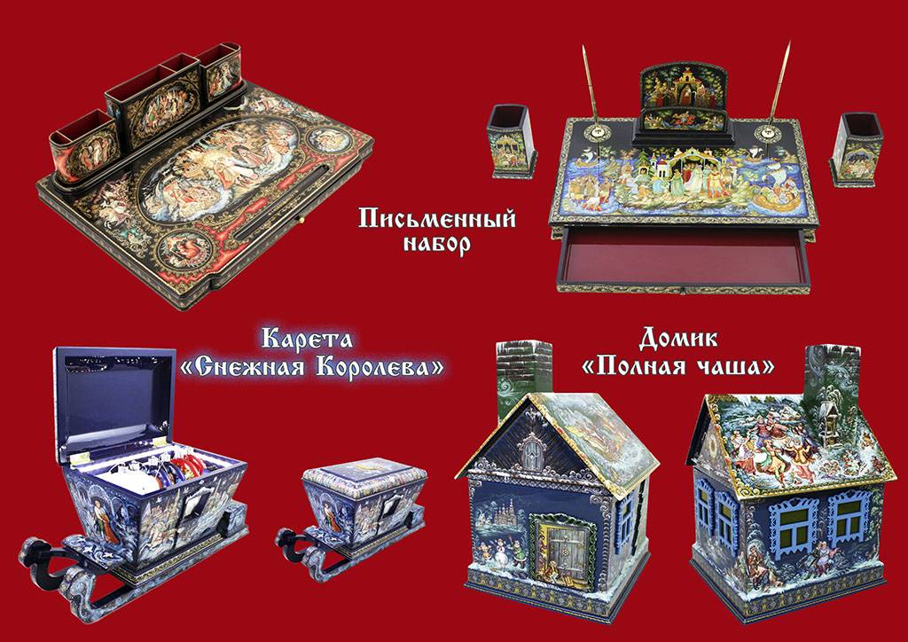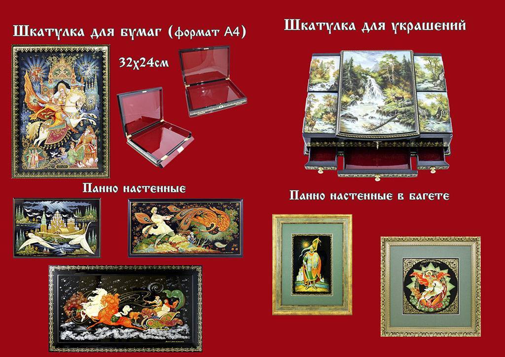 Собственная производственная база, соблюдение древних традиций, высокий потенциал высококвалифицированных специалистов и художников, позволяют выпускать: иконы, ларцы, шкатулки, настольные приборы, новогодние игрушки и многие другие изделия с лаковой миниатюрной росписью.