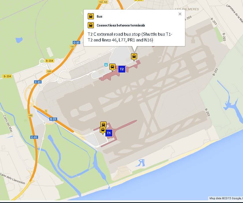 - Отправление только от Терминала Т2, автобус не доезжает до Терминала 2, а едет дальше в пригород до городка Кастельдефельс (Castelldefels).