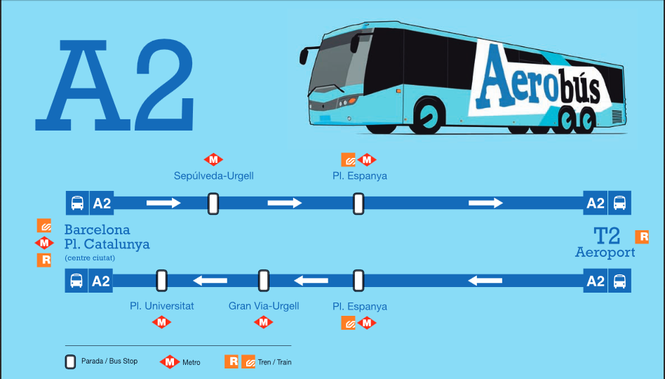 Экспресс «A2 Аэробус» ходит из Терминала 2 аэропорта Барселоны до площади Каталонии (Plaça Catalunya), через площадь Испании (Plaça Espanya), улицу Gran Via и станцию метро Urgell, площадь Университета (Plaça Universitat). Время отправления: с 6.00 утра до 0.30 ночи. Билеты продаются в автобусе. Время в пути составляет 30 — 40 минут. Экспресс ходит каждые 10–20 минут (в зависимости от времени суток).