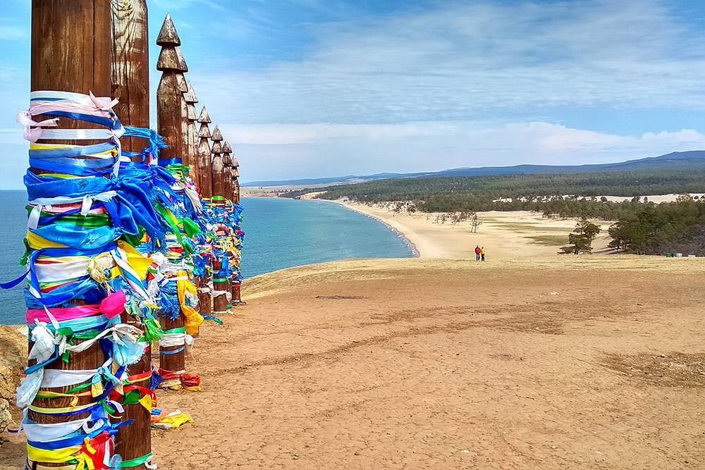Молитвенные столбы Сэргэ и вид на пляж. По легенде, столбы нельзя демонтировать, они должны разрушиться сами. Оставить подвязку может каждый