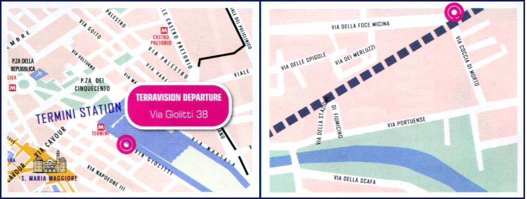 На схеме ниже (слева) показано, что остановка автобусов Terravision расположена с южной стороны вокзала Termini по адресу: Via Giovanni Giolitti, 38. От вокзала до аэропорта Fiumicino они идут без остановок, но после аэропорта доезжают до площади Piazza Alcide De Gasperi городка Fiumicino (на схеме справа).