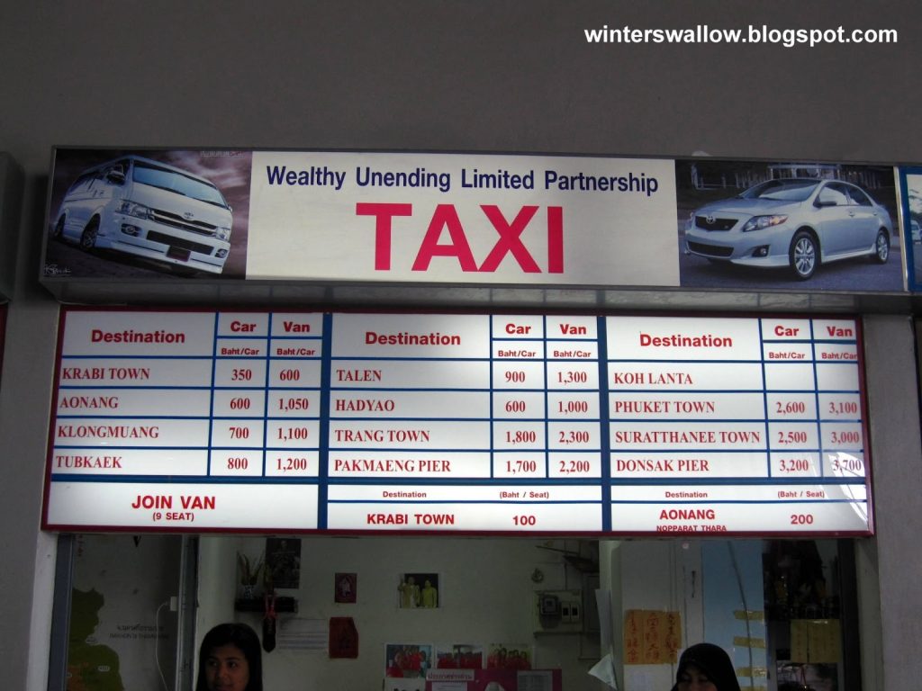 Расстояние (по дороге) от аэропорта Краби до Пхукета составляет 160 км, до Ко Ланты: около 80 км. На Пхукет или Ко Ланту выгоднее добираться с автовокзала: билет стоит 150 бат на автобус до Пхукета и 350 на минивен до Ко Ланты. Цены из аэропорта на такси просто грабительские: 2600 и 2500 бат соответственно