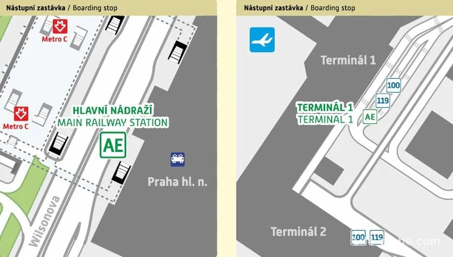 Автобусы Аэропорт Экспресс линии АЕ (Airport Express) обеспечивают прямое сообщение между аэропортом Праги и Главным железнодорожным вокзалом Праги (Praha hlavní nádraží), где они останавливаются прямо перед зданием вокзала.