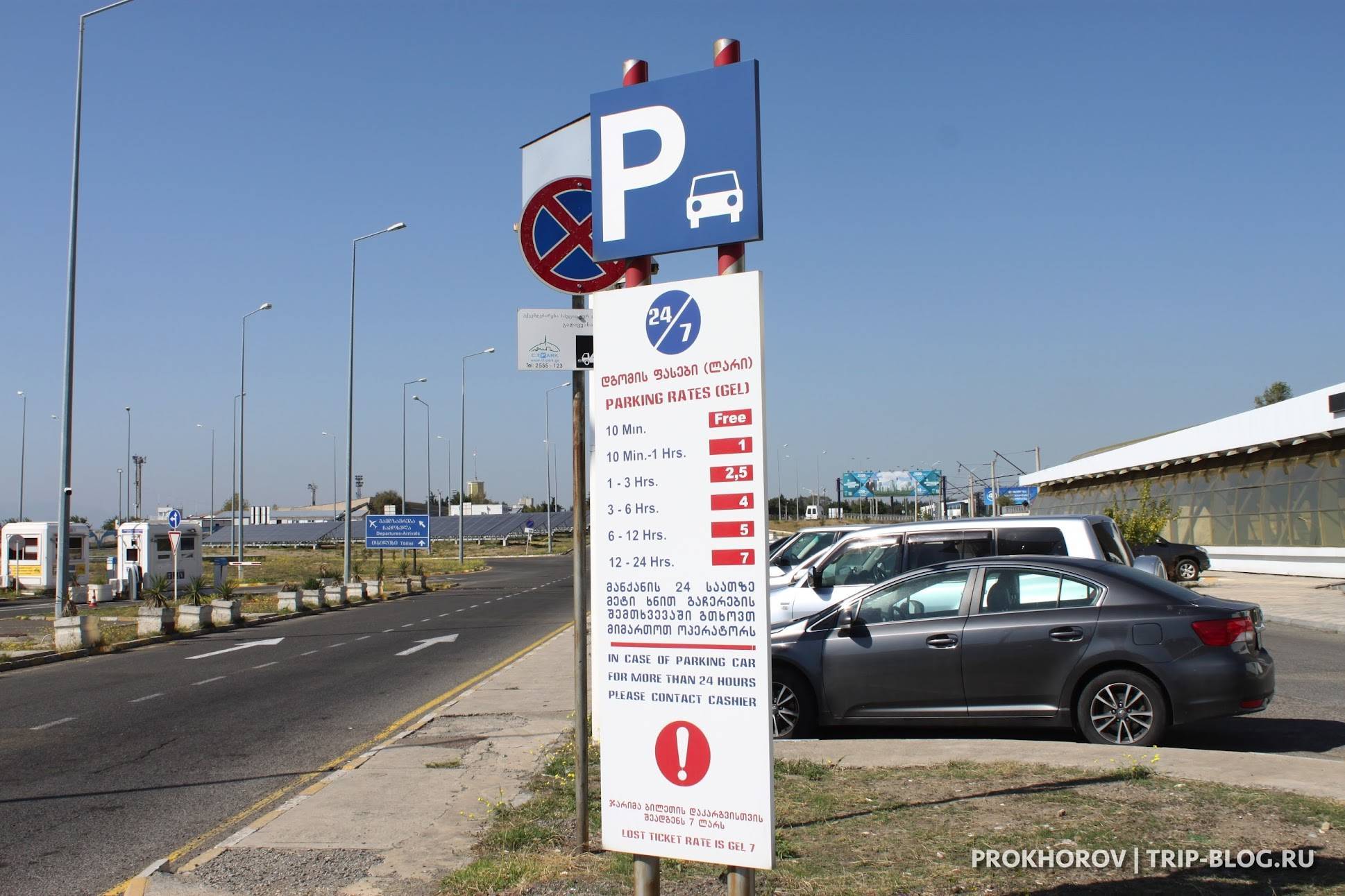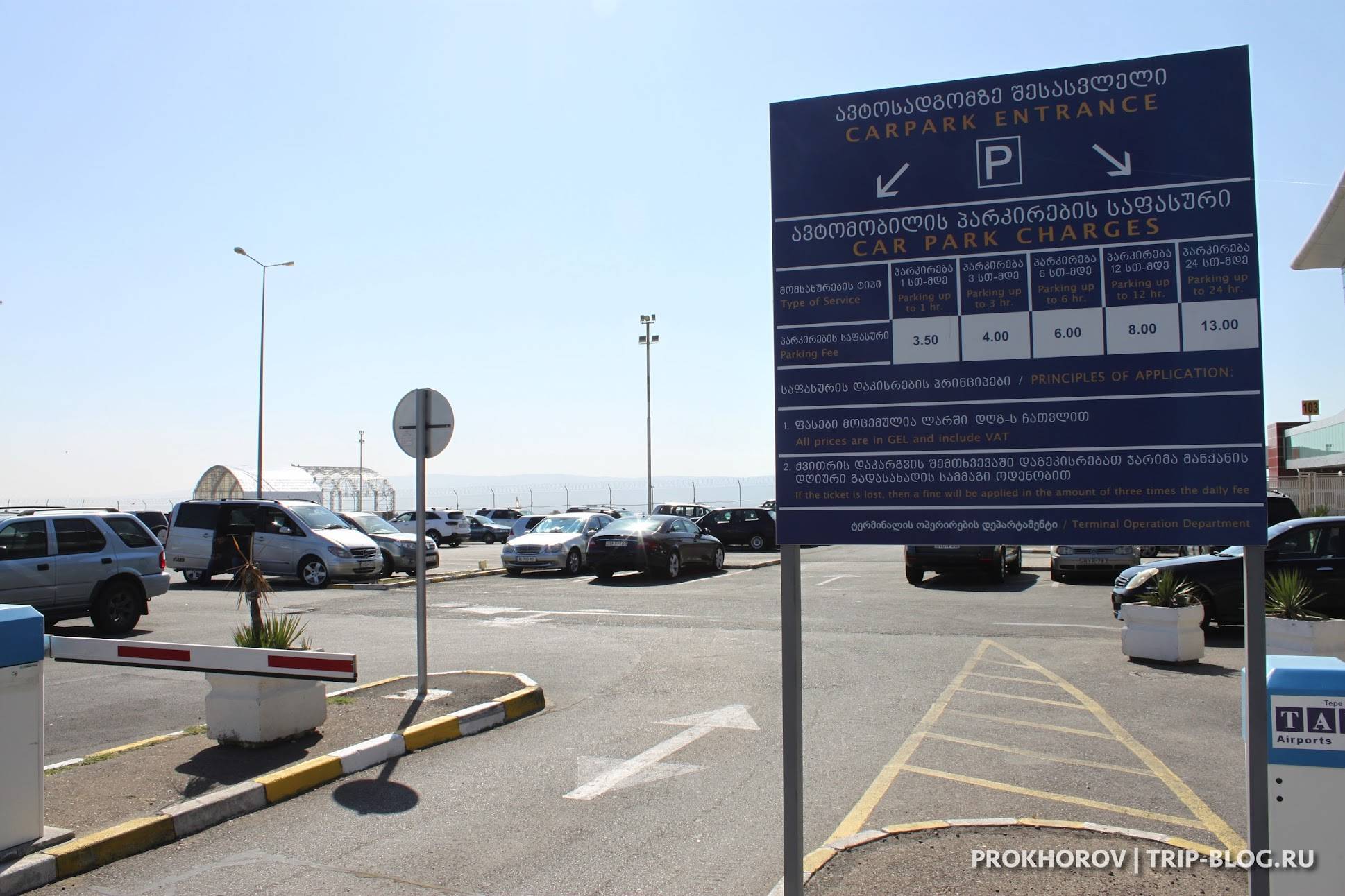 Самая крупная и современно оснащенная парковка на 658 машиномест, находится при центральном аэропорте в г. Тбилиси. Стоимость парковки начинается от 3,5 лари в час и варьируется от количества времени. Так, сутки на парковке аэропорта им. Шота Руставели обойдутся в 13 лари. Парковки в аэропортах Батуми и Кутаиси примерно одинаковы по объему и вмещают чуть более 100 автомобилей одновременно. Стоимость парковки: 1-2 лари/час.