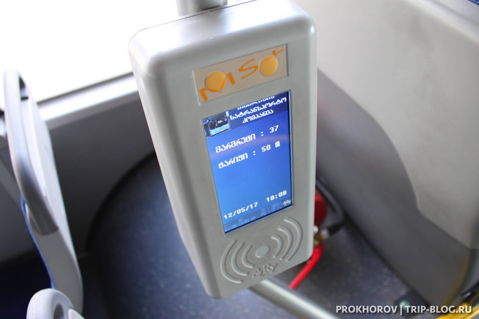 Стоимость проезда составляет 50 тетри, что эквивалентно примерно 20 центам или 12 рублям. Оплатить проезд можно универсальной проездной карточкой «Мetromoney», нужно ее приложить к специальному аппарату, который спишет с нее необходимую сумму. Имейте в виду, что в аэропорту карточка не продается, ее можно купить только в городе, на любой станции метро. Если у вас нет карты, то оплатить проезд можно наличными в специальных автоматах внутри автобусов. Учтите, что аппарат сдачу не выдает, поэтому разменивая деньги в аэропорту, попросите дать вам мелочь по 50 тетри.
