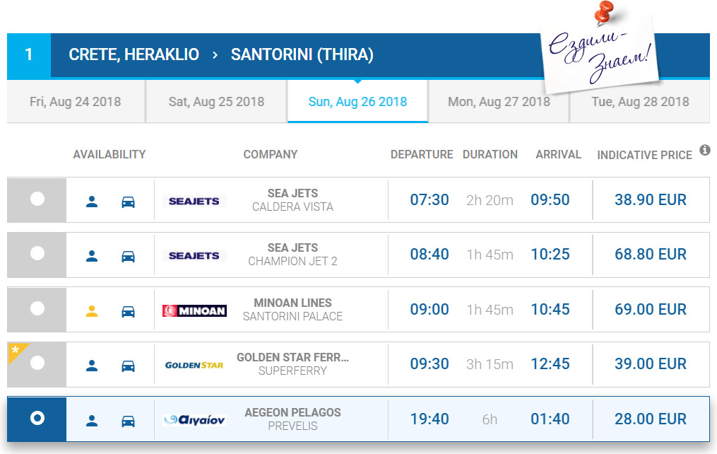 Билеты на паромы с Крита на Санторини и обратно лучше приобретать заранее. Самый удобный вариант – воспользоваться англоязычным сайтом https://www.ferriesingreece.com, где можно быстро найти места на удобную дату и сразу же их забронировать. Билеты можно также купить в киосках судоходных компаний, расположенных в портах отправления.