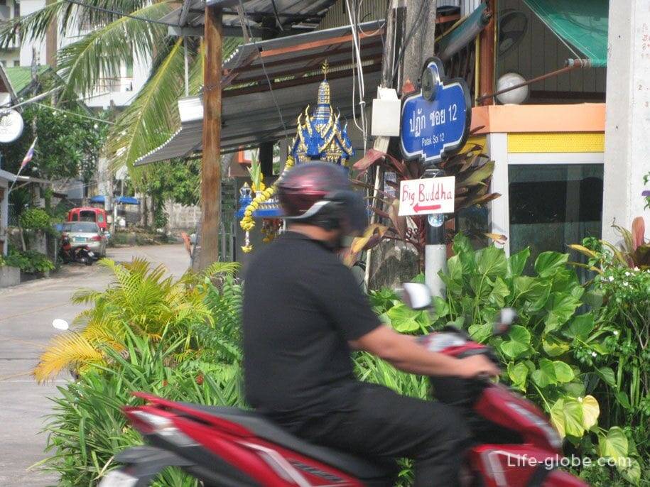 С пляжей Ката и Карон выходим на проезжую широкую дорогу Patak Rd, проходящую выше линии пляжа. Следуя по данной дороге, с пляжа Ката в сторону Карона, а с Карона в сторону Каты, по пути будут отходить улицы в гору, ориентиры – указатели «BIG BUDDHA». До данных отворотов также можно доехать на общественном автобусе «Phuket town – Karon – Kata». Путь до с пляжа Ката составляет, примерно, 8 километров, от Карона чуть меньше – где-то 6,5.