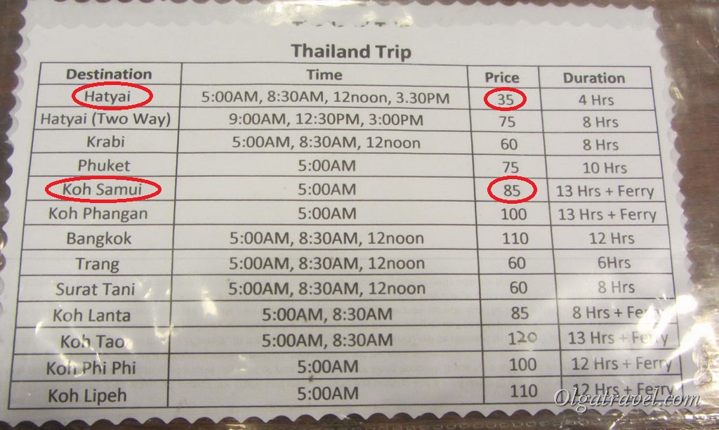 Мы из Пенанга ехали в Камерон Хайлендс, а не возвращались домой на Самуи, но расписание и цены на автобус Пенанг – Хат Яй и Пенанг – Самуи узнали: