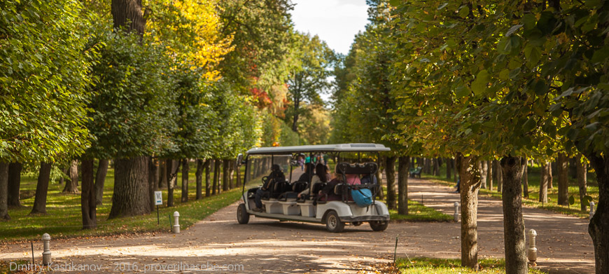 Имейте в виду, что в сезон, да еще и в выходные, стоимость билета подскакивает до 900 рублей за человека. Зато вас провезут по всему парку, вы увидите самые интересные места, а приятный голос из динамика будет все это время рассказывать интересные сведения. Как раз те, что вы услышали бы от экскурсовода, если бы купили экскурсию у Гостиного двора. Правда, сделать фотографии во время такой поездки будет весьма сложно.