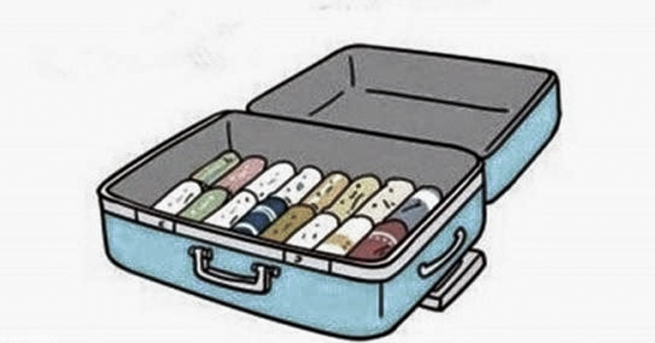 Первый слой — смотанные в рулон футболки, блузки, летние платья и т. п. На самом деле если паковать вещи таким образом, то они не только практически не мнутся и готовы к носке, но и доставать нужную вещь проще — все видно, не нужно перебирать стопку. Очень удобно если вы постоянно передвигаетесь, и чемодан до конца в поездке не распаковываете. Photo: imguru.com