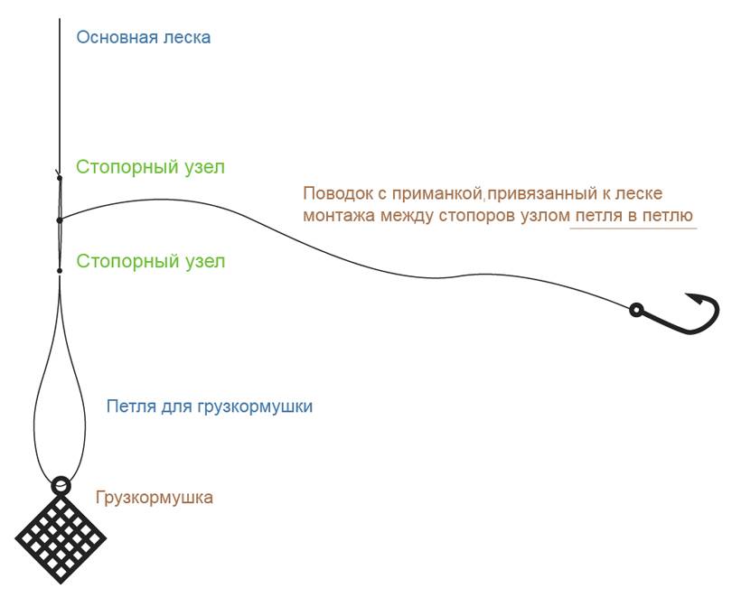 Совет! В этой оснастке есть смысл крепить поводок не сразу после стопора, а сделать скрутку или привязать жесткий отвод размером в 15-20 сантиметров для предотвращения перехлестов.