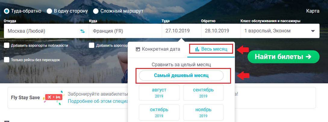 Самый дешевый месяц — подходит тем, кто не привязан к дате. Позволяет выяснить, когда поездка в выбранную страну будет стоить меньше. При вводе даты выбирайте «весь месяц», затем «самый дешевый месяц».