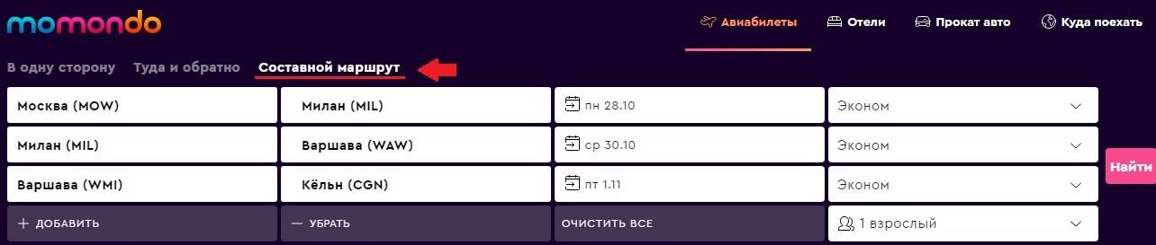 Составные маршруты — полезная опция для тех, кто самостоятельно организовывает турне. Вам нужно выбрать соответствующую вкладку, указать интересующие направления и кликнуть «найти». Система подберет бюджетные варианты.