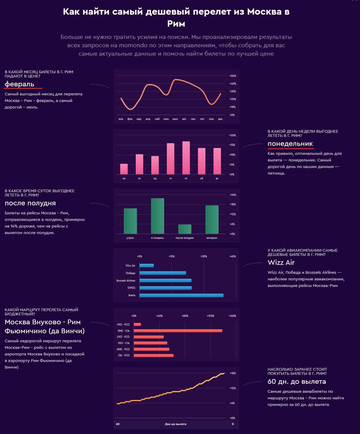 Откроется панель с результатами анализа запросов Momondo. Билеты падают в цене в феврале, выгодный день для перелета — понедельник. Наиболее бюджетным является маршрут с вылетом из аэропорта Внуково и посадкой во Фьюмичино (да Винчи).