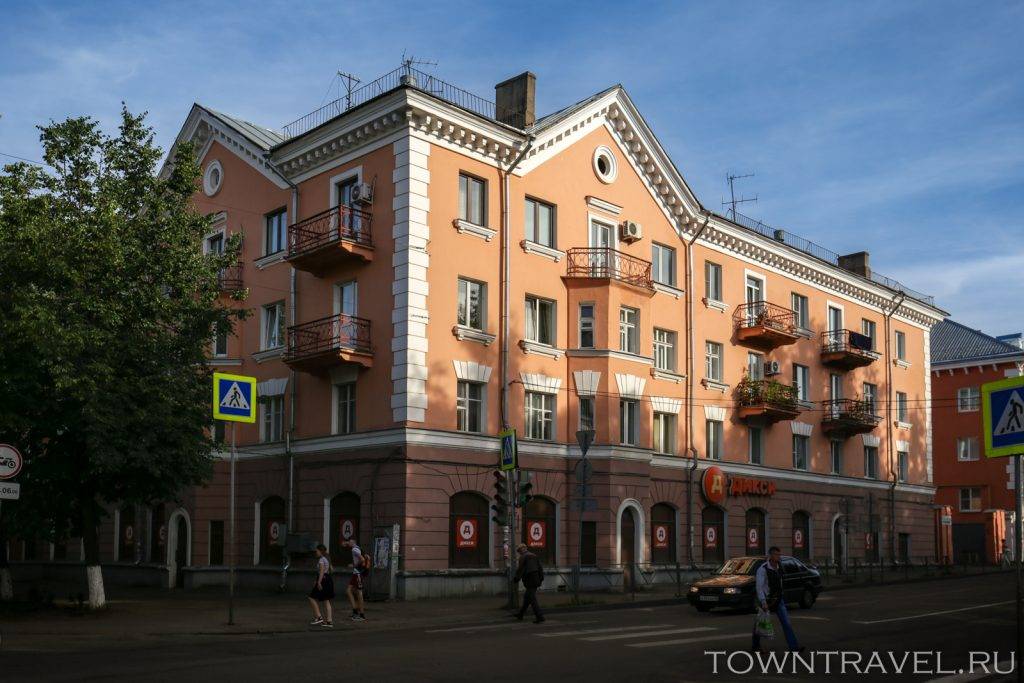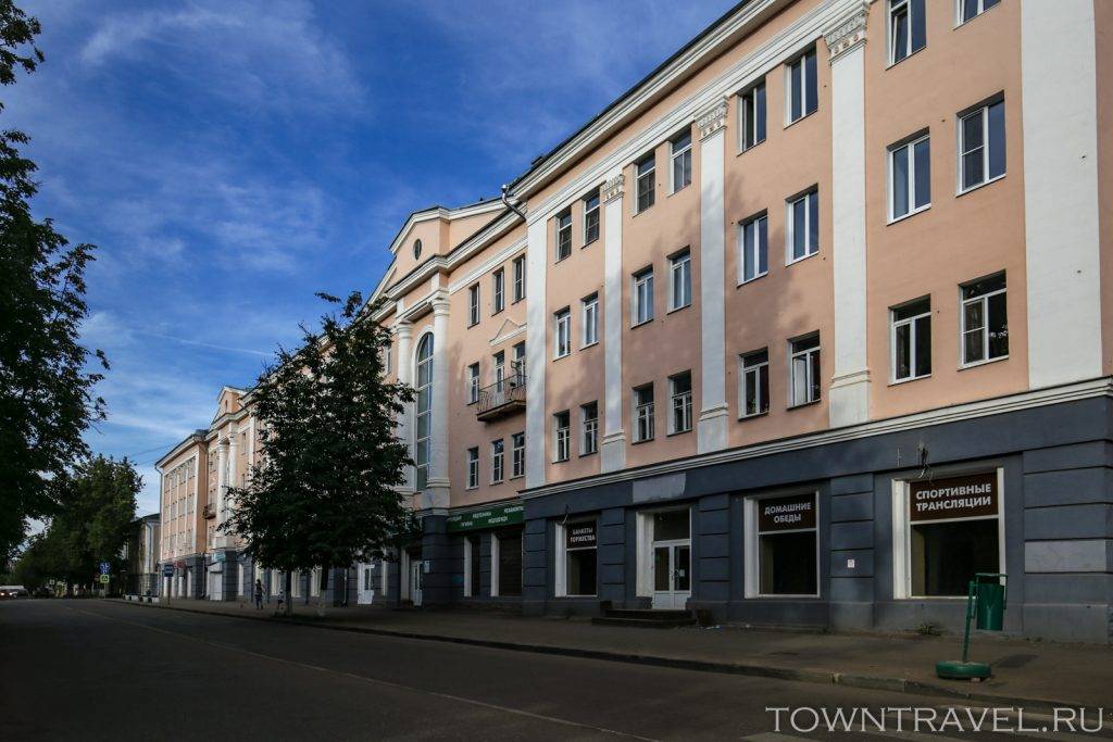 Рассмотрим строения, обрамляющие площадь Ленина. И начнем с парадной сталинки. Фасадом это дом выходит на площадь Ленина, а обратной стороной – на Свято-Вознесенский собор. Это жилой дом, но ему повезло находиться в самом центре города, поэтому за чистотой его фасада очень хорошо следят.