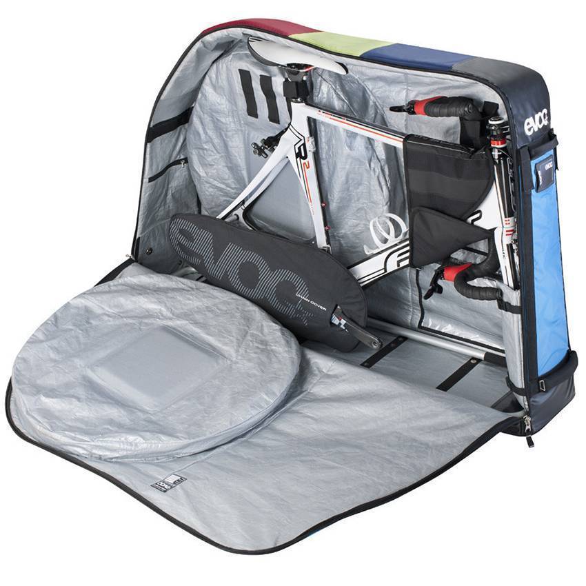 Благодаря специальным стяжкам можно упаковывать велосипед с двумя снятыми колесами. Помимо этого, этот чехол имеет дополнительные секции, в которые можно укладывать любые вещи и спортинвентарь к велосипеду.