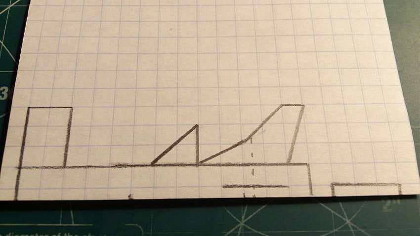 Как только проектирование завершено, нужно проверить конструкцию. Для этого я сделал эскизы моей модели в масштабе 1:2. С помощью этого нового эскиза я сделал планерную версию своего самолёта из пенопластика. Изготовление прототипа началось с создания фюзеляжа в виде боковой проекции с рулем высоты. Затем в фюзеляже был вырезан паз под хвостовое оперение
