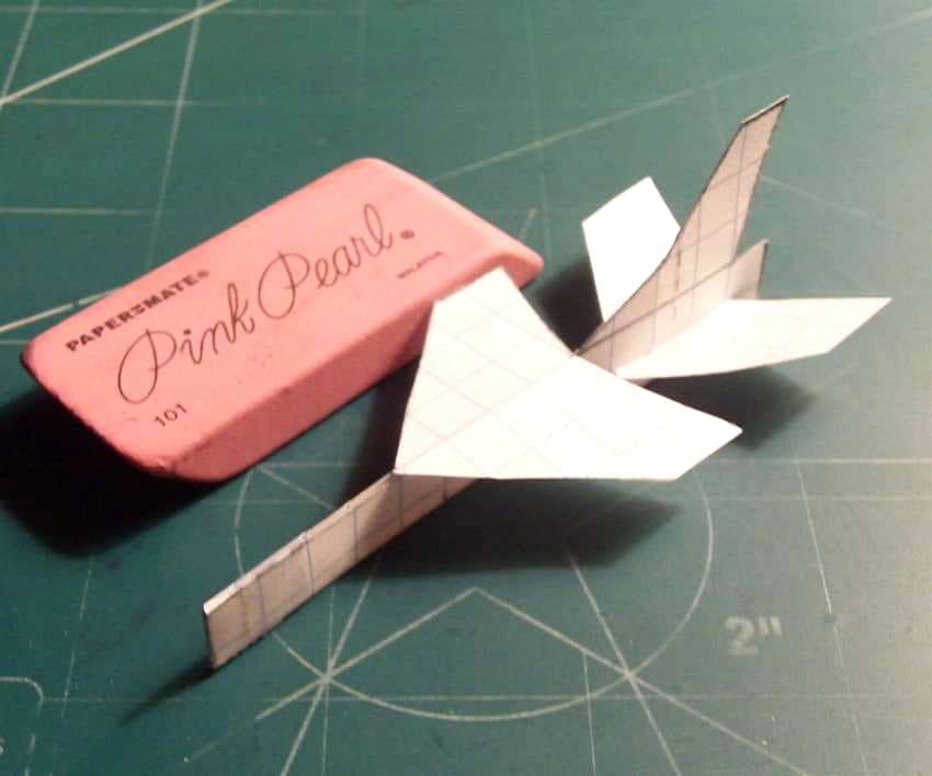 Всем, кому нравятся миниатюрные бумажные самолетики, эта модель тоже обязательно понравится. Сначала надо будет нарисовать и вырезать детали, как показано на фото ниже. Как только это будет сделано, начните делать крылья и горизонтальный стабилизатор. Изготовление крыльев следует начинать с рисования линии с уклоном. Вдоль передней кромки, в точке, где толщина крыла достигает 3 клеточек, сделайте горизонтальную линию, которая растягивается на 1,5 клетки внутрь. Затем соедините края. Чтобы сделать горизонтальный стабилизатор, отметьте 3 клеточки, которые имеют по крайней мере 1 клетку за ними. Наклон передней кромки должен составлять 3/2, а задней кромки – 3/1.