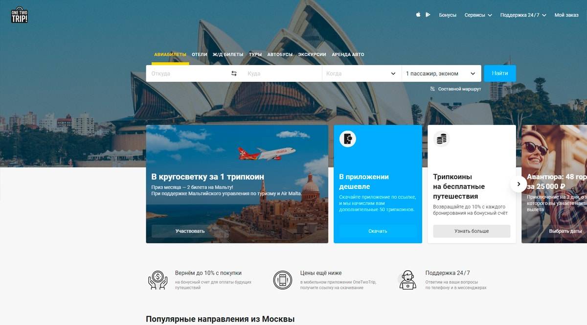 Если скачать мобильное приложение для телефона, то можно получить более выгодные предложения на транспортировку по воздуху. Круглосуточная поддержка обеспечивает помощью по любым вопросам. OneTwoTrip отмечает 6 популярных направлений в России: Сочи, Санкт-Петербург, Калининград, Казань, Самара и Краснодар.