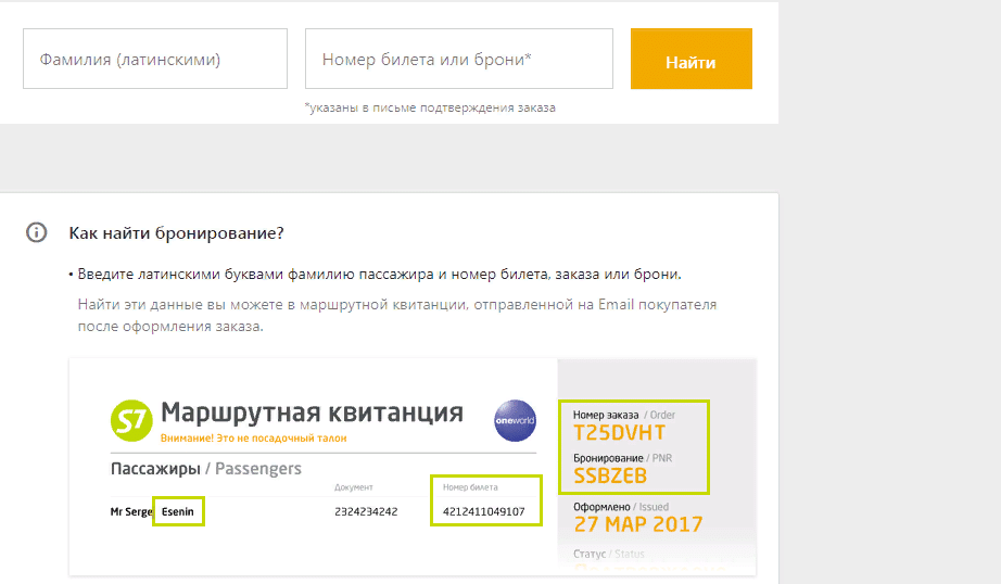 К электронным относятся авиабилеты, купленные на официальном сайте S7 или через мобильное приложение. Для этого существует специальная функция в личном кабинете, на сайте www.s7.ru. Вводим данные и переходим в раздел «Мои бронирования».