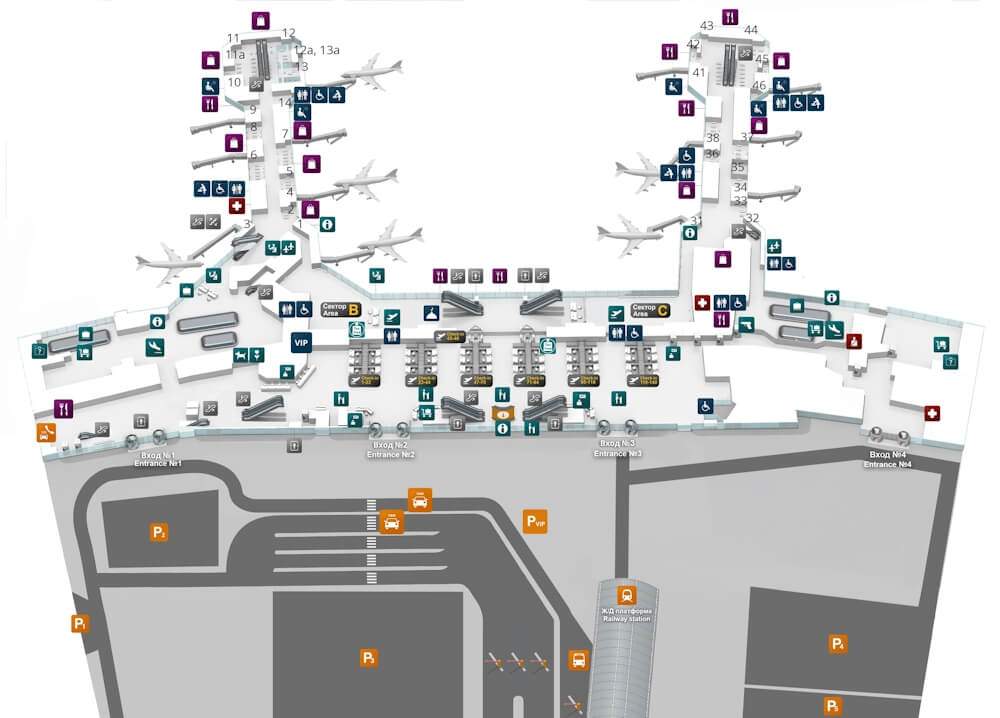 - На 4-х воротах находятся медицинский кабинет, пункт полиции, вход к платформе аэроэкспресса.