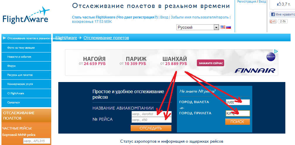 FlightAware – еще один развитый сервис для отслеживания самолетов. Его преимущество заключается в том, что он представлен на 18 языках, в том числе и на русском. Поэтому русскоговорящие пользователи могут легко узнавать сведения о полетах на родном языке.