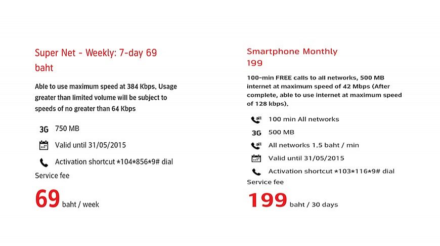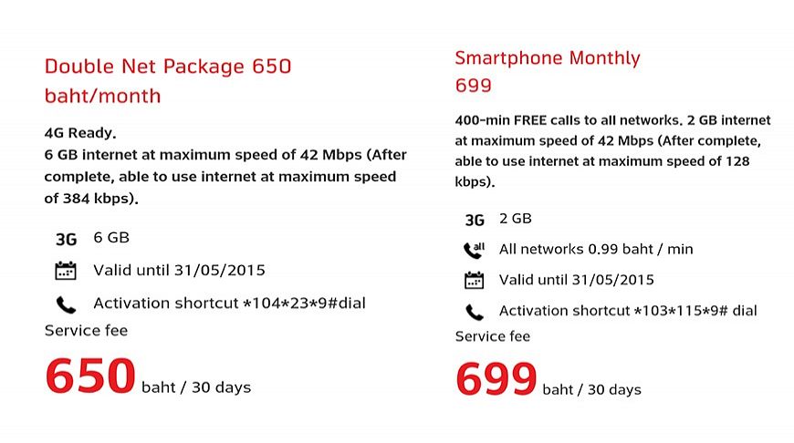 Пакет стоит от 49 батов, на счету будет 15 батов. Также есть предложение по 299 и 599 батов (100 батов уже на счету). В них входит соответственно 7 и 14 дней безлимитного Интернета (до 1,5 ГБ). Чтобы карта оставалась активной, в течение 35 дней нужно пополнить баланс.