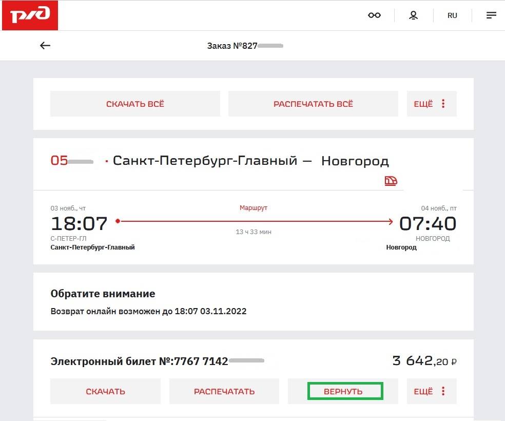 Рис. 2. Клик на кнопку «Вернуть» билет на поезд РЖД.