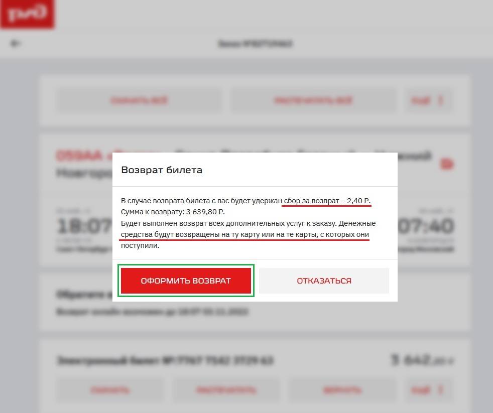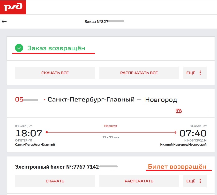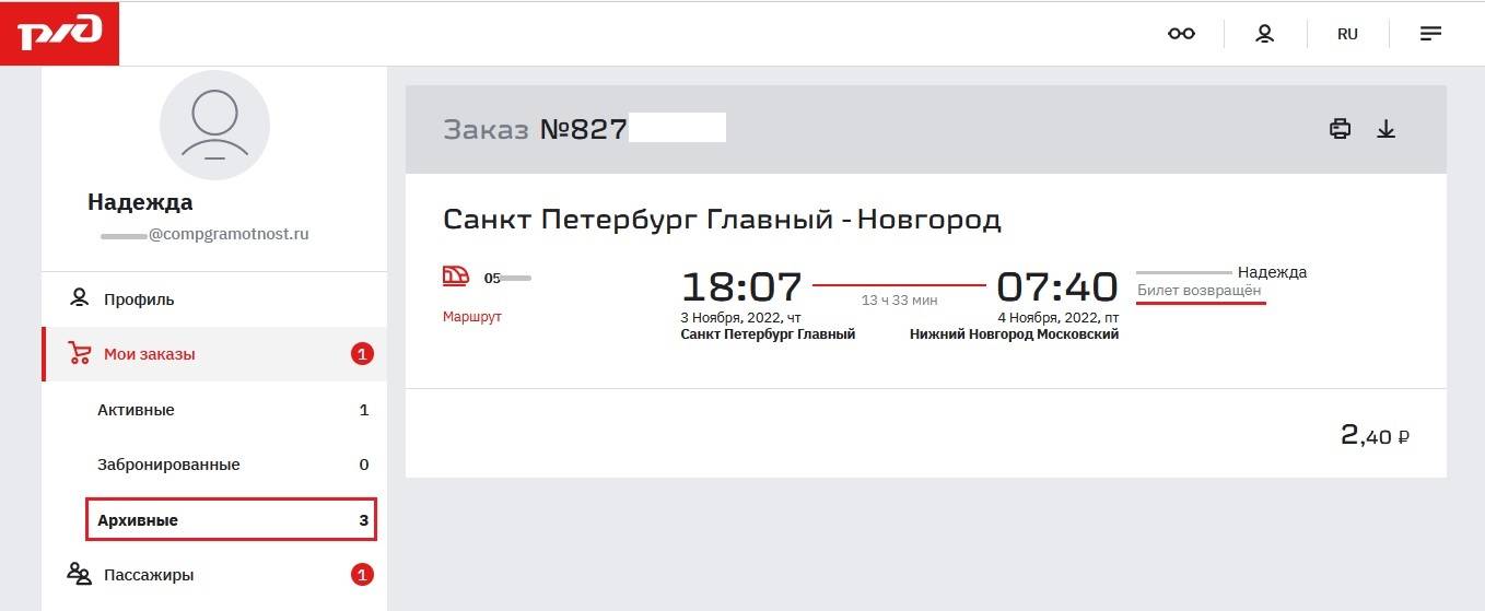 Рис. 3. Информация о возврате билета на сайте РЖД.