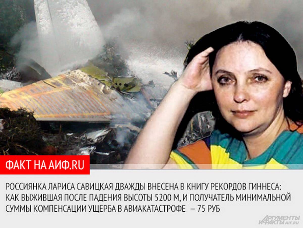 Лариса Савицкая дважды внесена в Книгу рекордов Гиннеса: как человек, выживший после падения с максимальной высоты, и как человек, получивший минимальную сумму компенсации физического ущерба в авиакатастрофе — 75 рублей (в деньгах 1981 года).