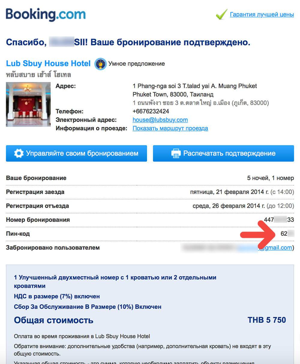 Его желательно сохранить или распечатать. Здесь содержится пин-код, а также адрес отеля для таксиста на тайском и для вас на английском.
