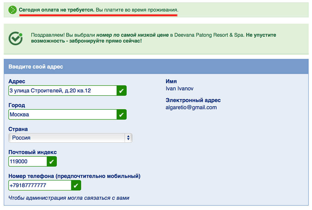 8) Вводите свои данные: электронную почту, телефон, ФИО, данные банковской карты и прочее. Потом оплачиваете или, если есть возможность бронирования без оплаты, то просто бронируете.