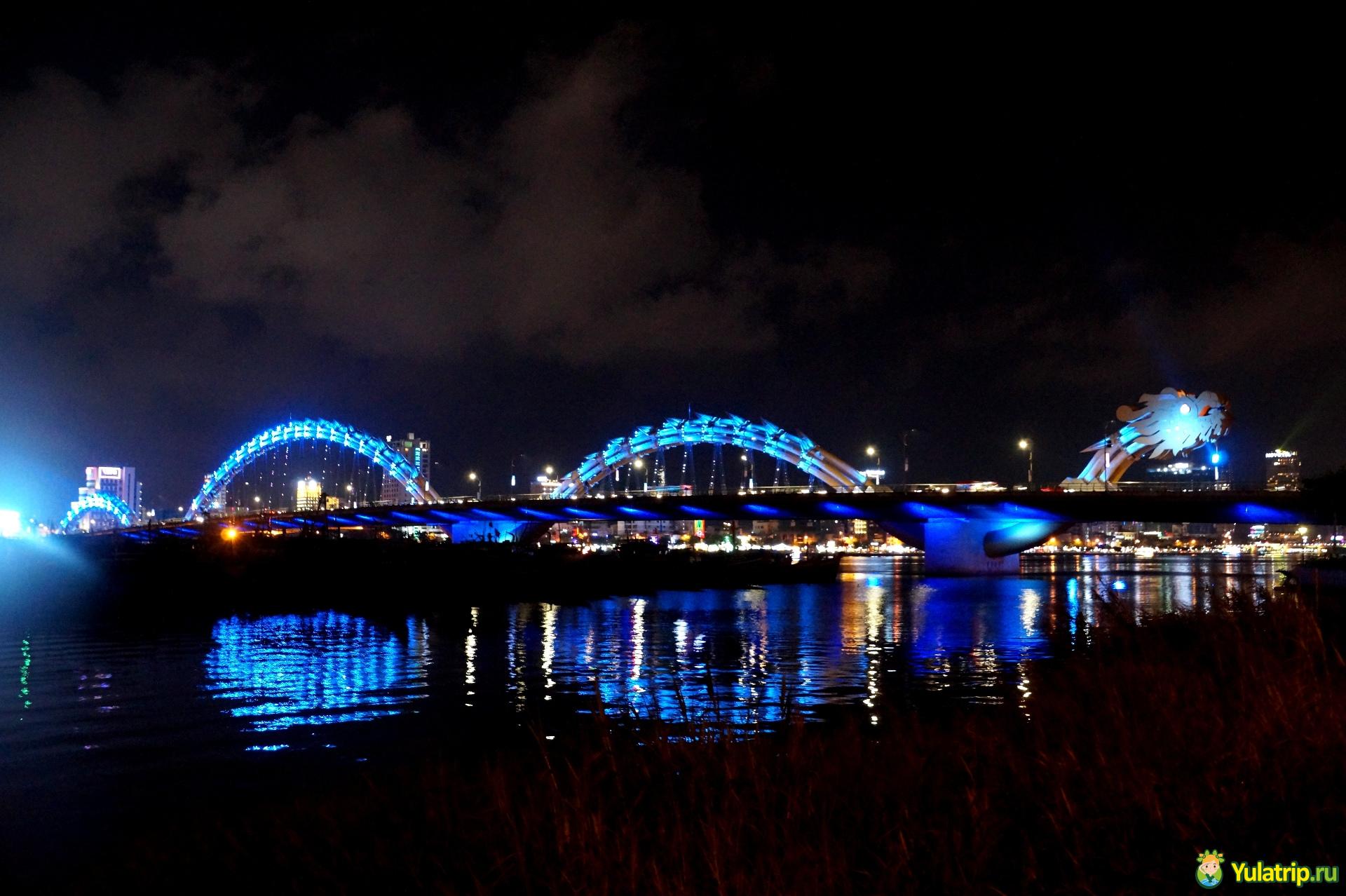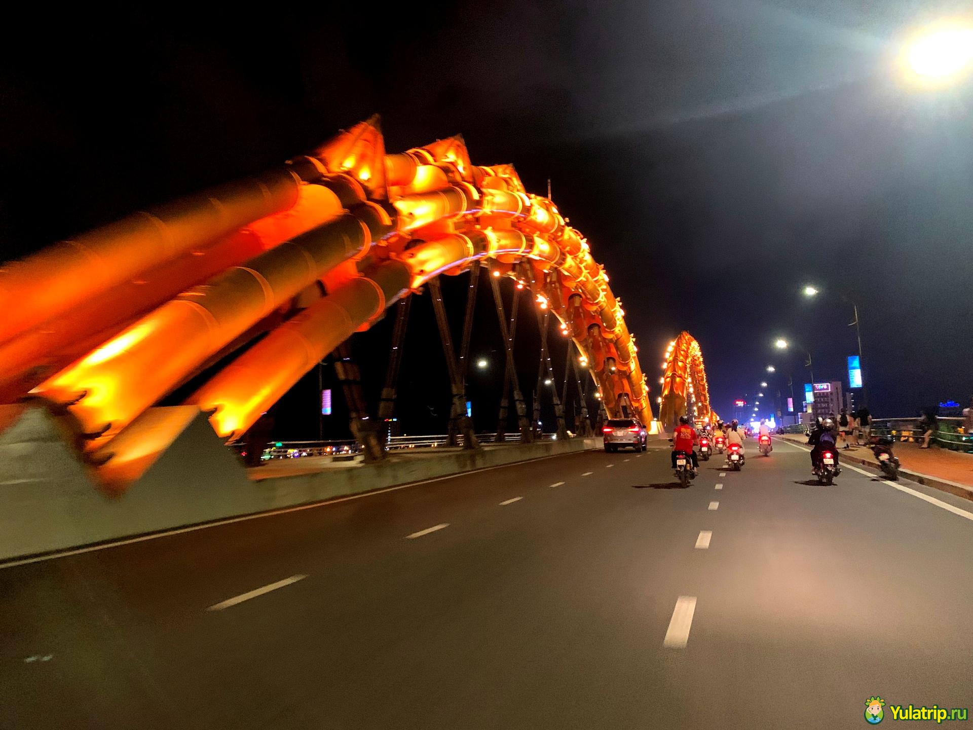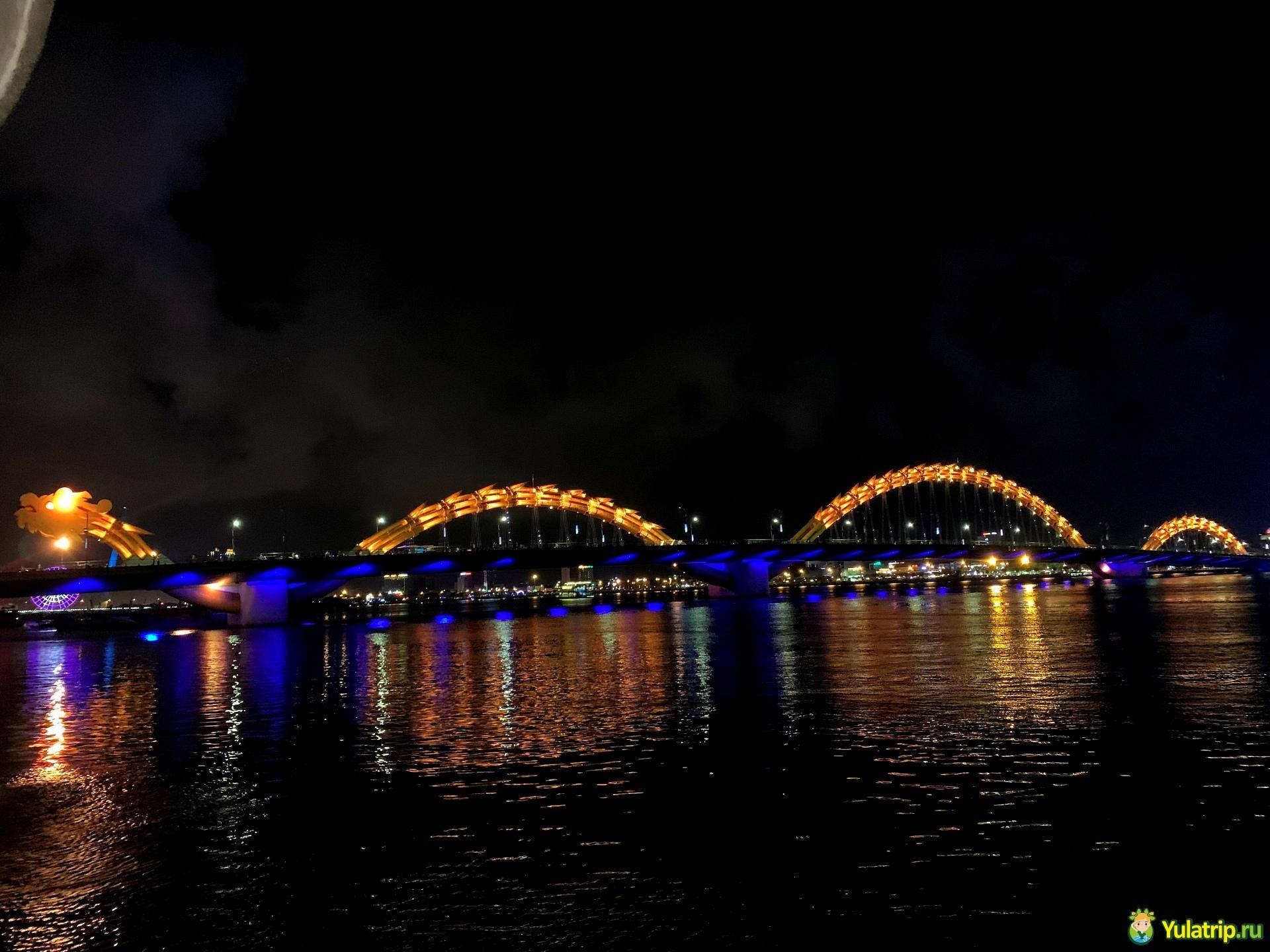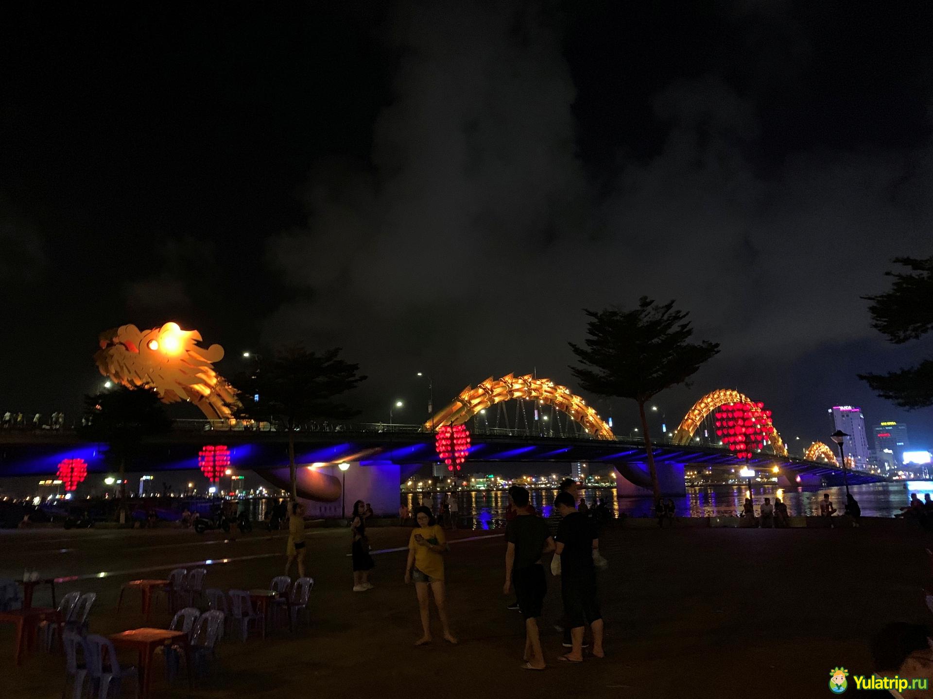 Мост Дракона загорается разными цветами — желтым, голубым, зеленым, красным, оранжевым. Наиболее эффектно он смотрится в желто-оранжевом освещении. На мосту многие останавливаются и пытаются сделать фотографии, но лучше фотографии делать с суши, так мост может войти в кадр полностью.