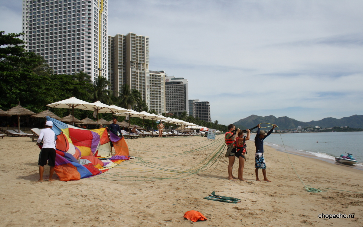 Банан, скутер, катамаран, кайтсерфинг, виндсерфинг, парасейлинг и прочие развлечения здесь доступны, достаточно подойти к людям, которые стоят у лежаков (продают места). Главное правило – торговаться, торговаться и еще раз торговаться. Первые цены, которые вам скажут, будут завышены на 20-30%. Например, когда мы парасейлили (летали на парашюте за катером), нам сказали 1 000 000 донгов, а реальная цена – 800 000 донгов.