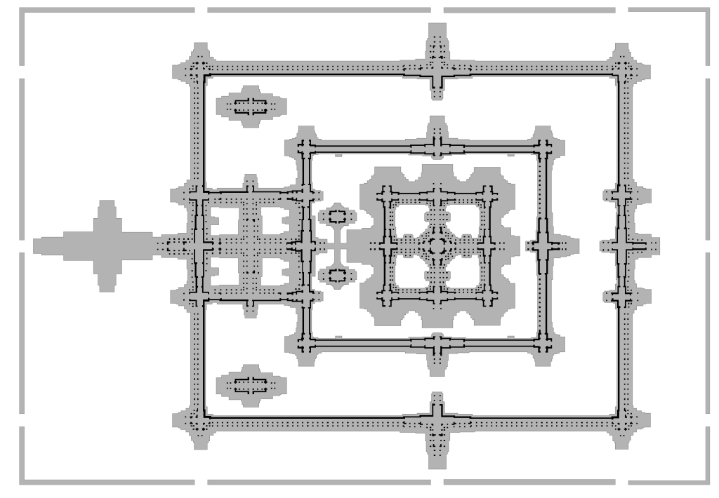 Центральными здесь являются 3 галереи идеальной прямоугольной формы. Третья галерея – самая известная, она искусно декорирована великолепными двухметровыми в ширину барельефами, длина которых – больше 700 м.