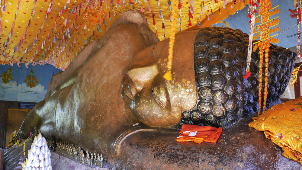 Огромный лежащий Будда из камня в монастыре Преах Анг Том. Его длина 9 м. Считается, что это самая большая статуя Будды в Камбодже