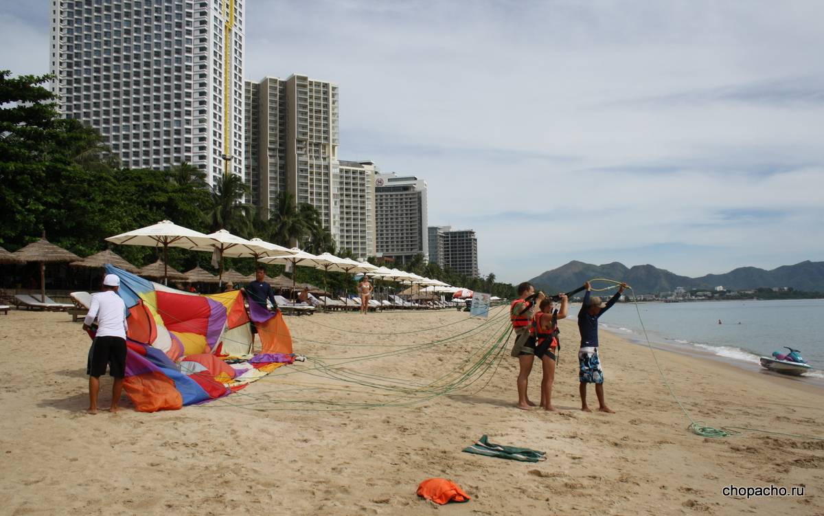 Банан, скутер, катамаран, кайтсерфинг, виндсерфинг, парасейлинг и прочие развлечения здесь доступны, достаточно подойти к людям, которые стоят у лежаков (продают места). Главное правило — торговаться, торговаться и еще раз торговаться. Первые цены, которые вам скажут, будут завышены на 20-30%. Например, когда мы парасейлили (летали на парашюте за катером), нам сказали 1 000 000 донгов, а реальная цена — 800 000 донгов.