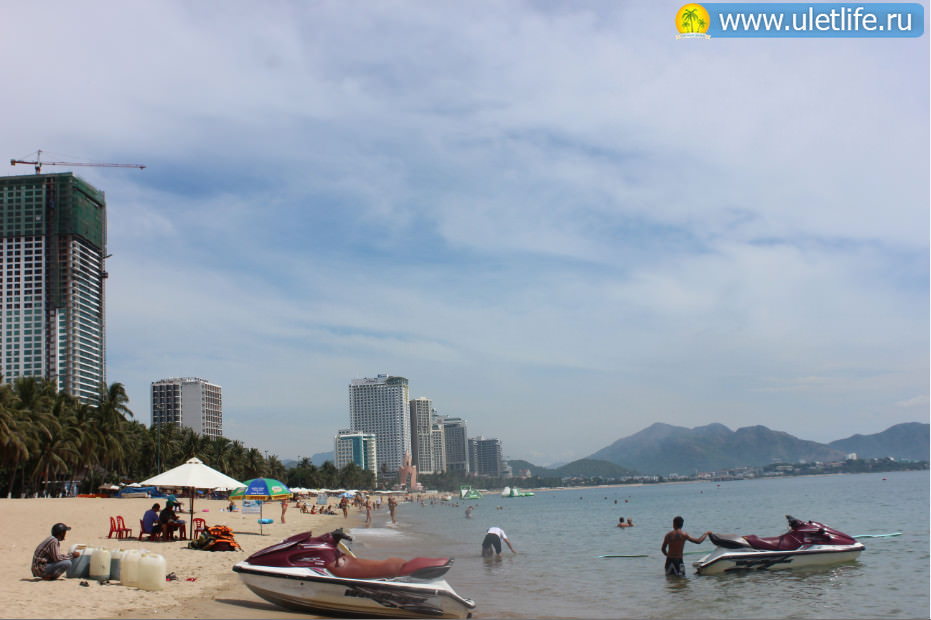 Побережье протянулось на 7 км. Фактически это один сплошной пляж, просто на разных участках отличается. Большинство отелей, шезлонгов и другой инфраструктуры находится в центральной части, рядом с Лотосом и торговым центром Nha Trang Central. По краям намного меньше инфраструктуры, отелей и народу.