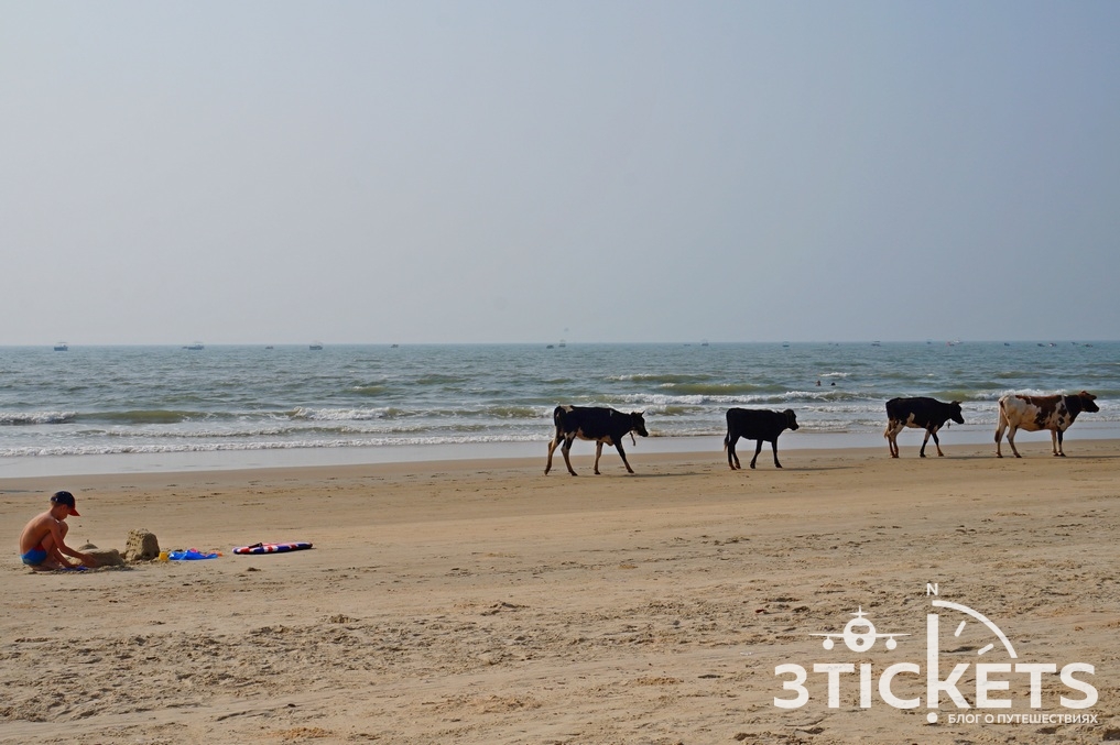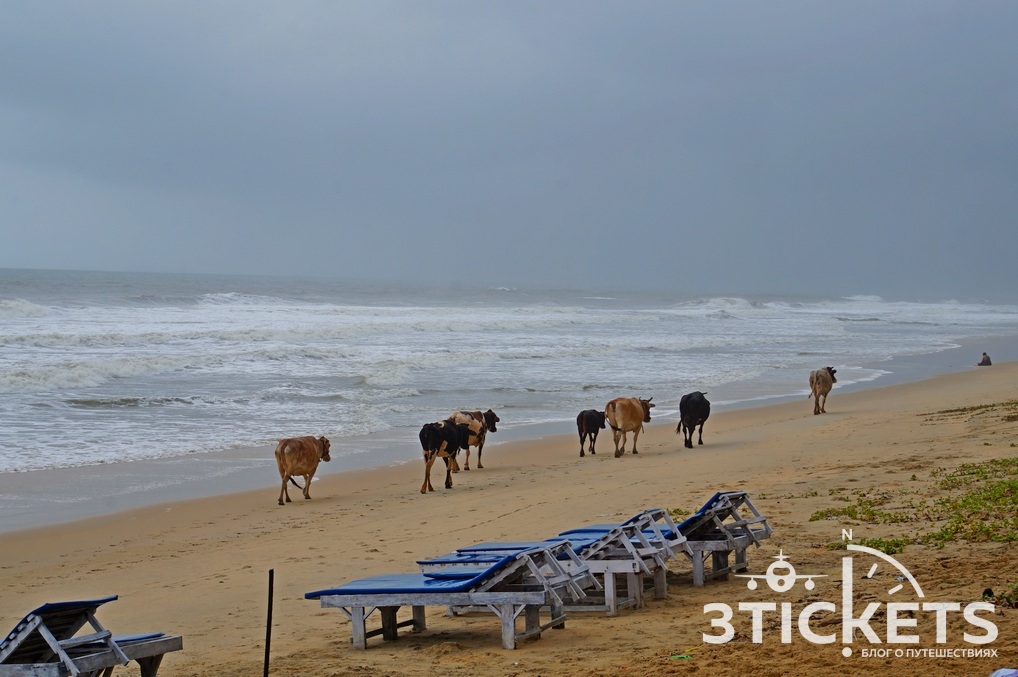 Дождь и ветер прогнали всех туристов с пляжа, и только вездесущим индийским коровам все нипочем