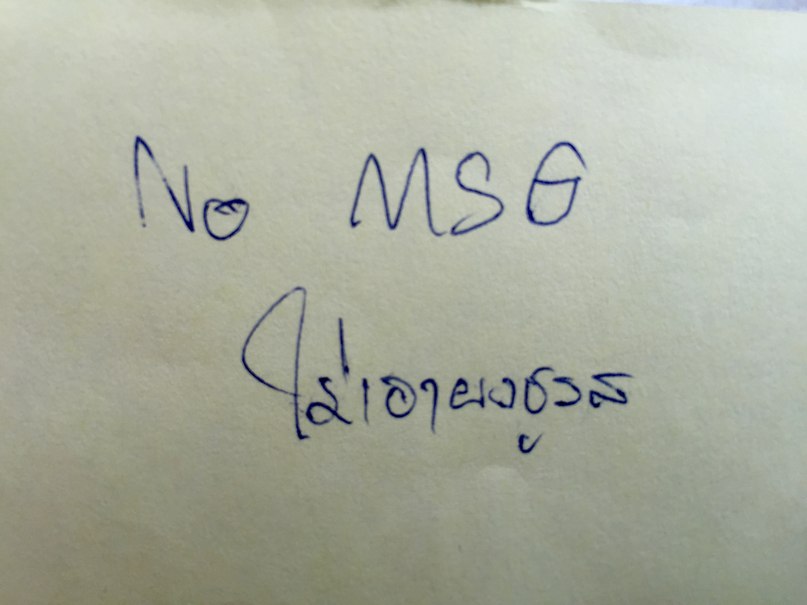 Во-первых, носите всегда с собой картинку NO MSG, написанную в том числе на Тайском языке (на картинке ниже) или сказав официантке волшебные: «май сай пон-чу-рот» или «mai sai pong chuu rot», что означает без глутамата натрия.