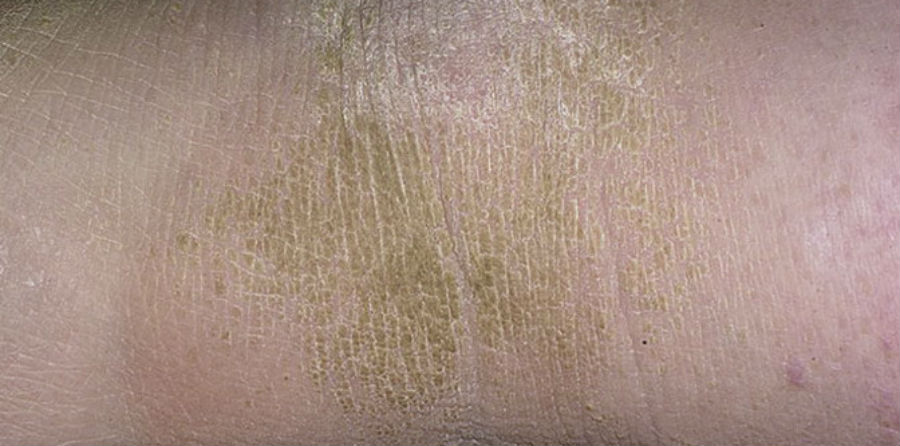 Грибок гиперкератоза стопы (также называемый грибком мокасинового типа) проявляется в виде диффузного гиперкератоза подошв, латеральных и медиальных поверхностей стопы. Кожа чешуйчатая, всегда присутствует эритема.