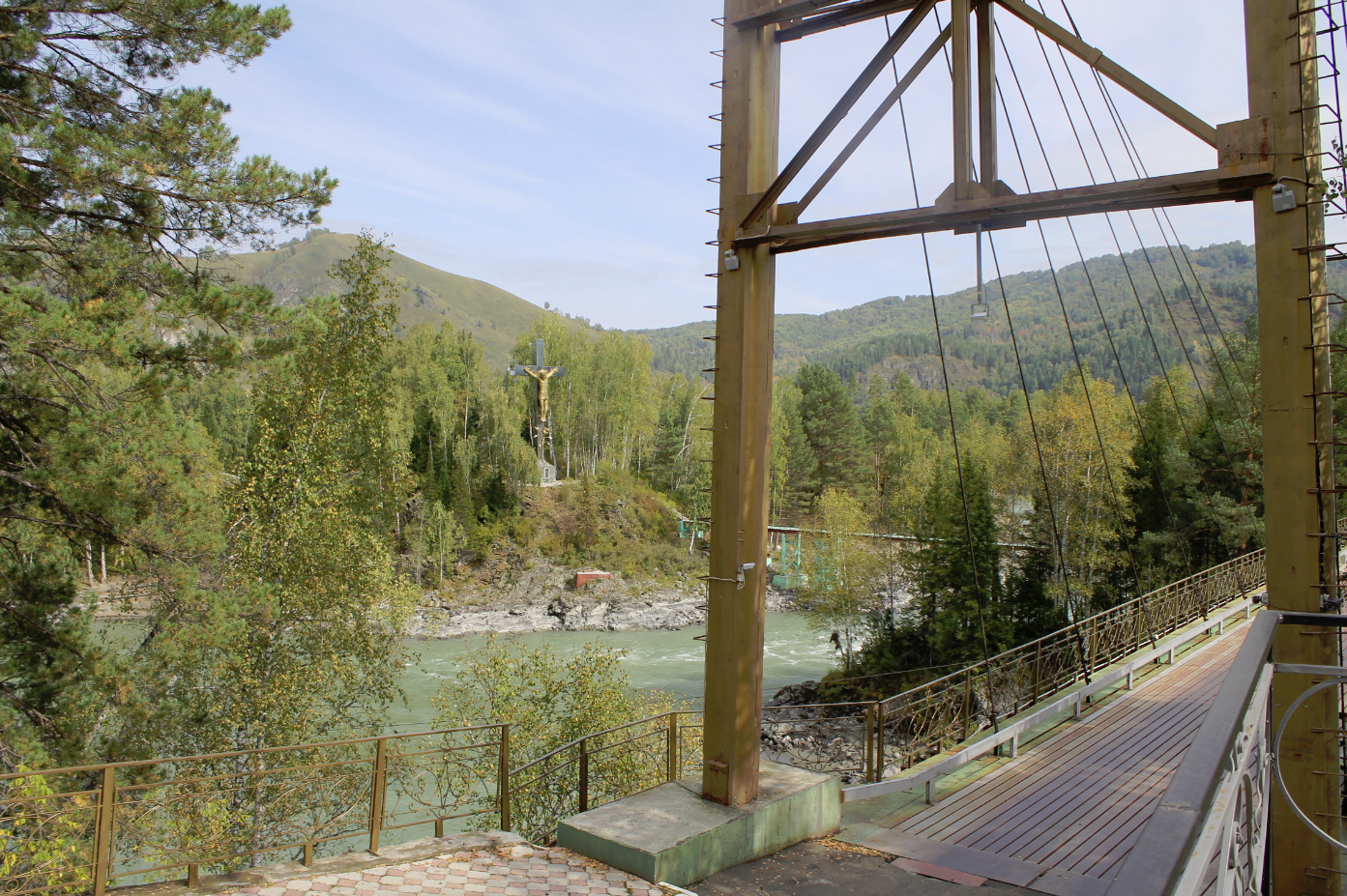 Еще одним живописнейшим местом Горного Алтая является территория пятизвездочного отеля Корона Алтая. Чтобы оценить красоту этих мест, совсем не обязательно покупать путевку в отель. Вход на территорию стоит всего 200 рублей со взрослого человека. Комплекс находится на двух островах посередине реки Катунь. Прогуливаясь по территории отеля, можно полюбоваться восхитительными пейзажами бурной реки, сфотографироваться со скульптурами и памятниками, гармонично вписывающимися в местные ландшафты. К слову, стоимость отдыха в этом отеле начинается от 5 тысяч рублей за номер в сутки.