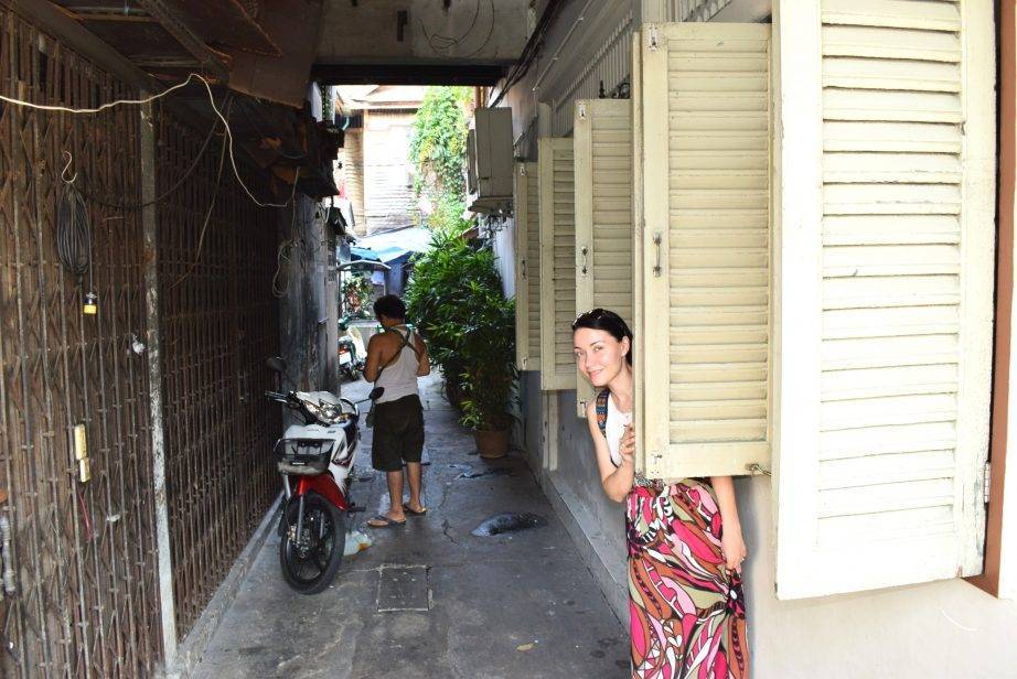 Пока мы шли к Биг Будде пешком, проходили вот такие колоритные переулки, с окошками. Было огромное желание заглянуть во внутренний дворик, но так и не решились нарушить частных границ. Чтобы прийти к Биг Будде в Бангкоке нам не понадобился общественный транспорт, с Каосана вполне реально можно дойти пешком. Так как место находится в другой части от ТОПовых достопримечательностей в Бангкоке, толп туристов здесь не бывает.