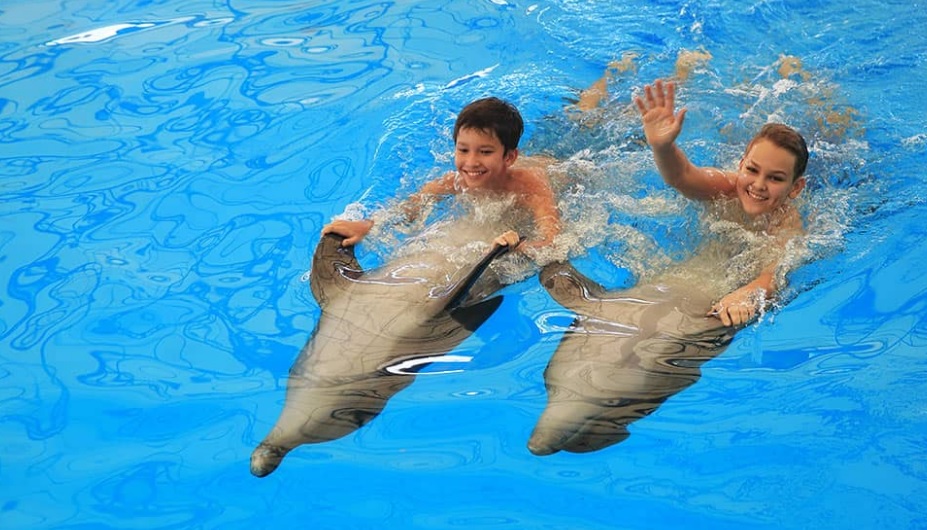 Дружелюбные дельфины прекрасно поддаются дрессировке. Поэтому они способны принимать участие в захватывающих выступлениях для зрителей каждые четыре часа. Синхронные прыжки, сложные сальто и всевозможные трюки отработаны морскими артистами до идеала. Особенно любят дельфины совместное купание с детворой и взрослыми.