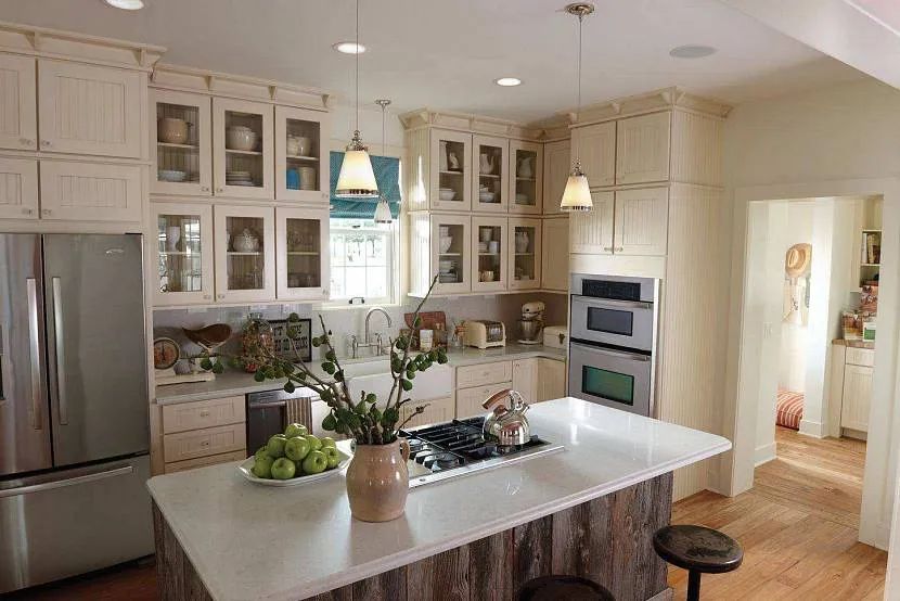 Выход: если кухня маленькая, отделите их деталями или оттенками, присущими стихи Дерева. - Нельзя на кухне делать многоуровневые потолки и пол с подиумами и ступеньками. Избегать стоит и свисающих балок, разве что они продиктованы строительной особенностью помещения или стилем в дизайне.