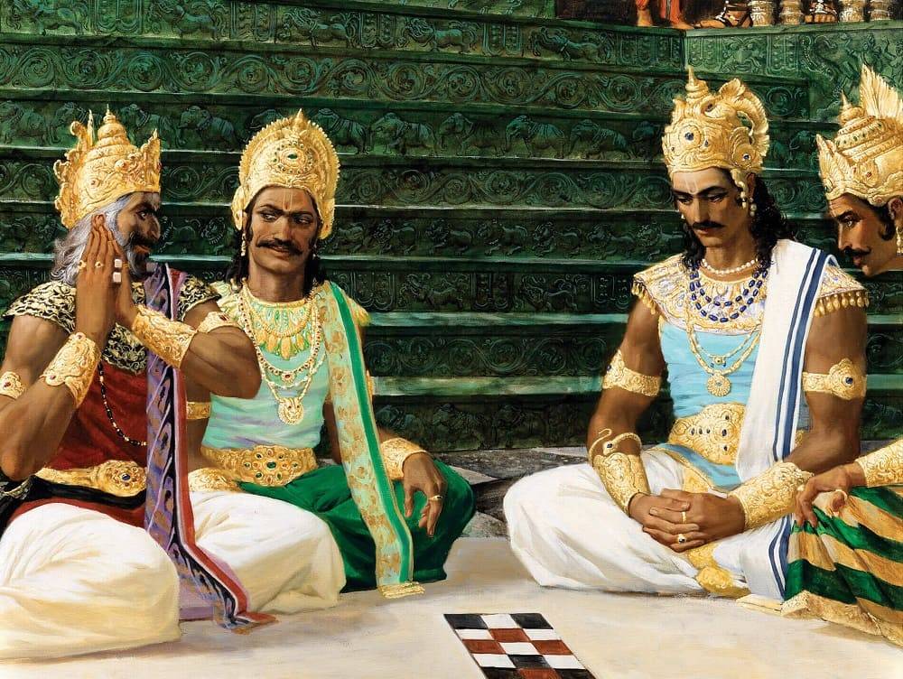 Чтобы насолить пандавам, Дурьодхана вызывает старшего из братьев, Юдхиштхиру, на поединок. Однако речь идёт не о сражении на мечах или копьях, а о шахматах. Знаменитый каурав был не так прост – в качестве своего помощника он выбирает своего дядю Шакуни, величайшего мастера шахмат и искуснейшего обманщика. Азартный пандав очень скоро остаётся гол как сокол.