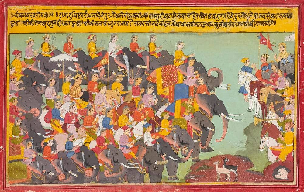 Кауравы на слонах против Пандавов на конях в битве на Курукшетре, 1700 годМестонахождение: Частная коллекция