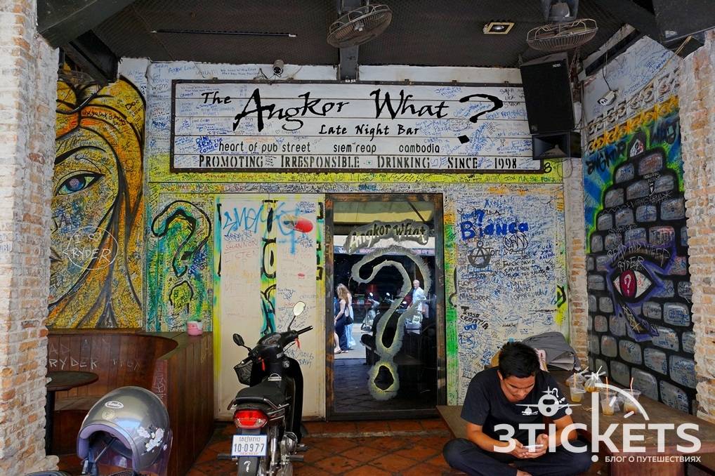 - Angkor What? bar — самый известный бар в Сиемрипе с недорогим алкоголем и зажигательной атмосферой. Их слоган гласит: «Поощряем безответственное употребление алкоголя с 1998 года».
