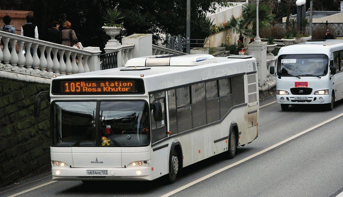 Автобус № 105: Отправляется от ТРЦ «МореМолл», идет через центр Сочи, автовокзал, ж/д вокзал и аэропорт Адлера. Заезжает в Хосту и Кудепсту. Прибытие — «Роза Хутор».