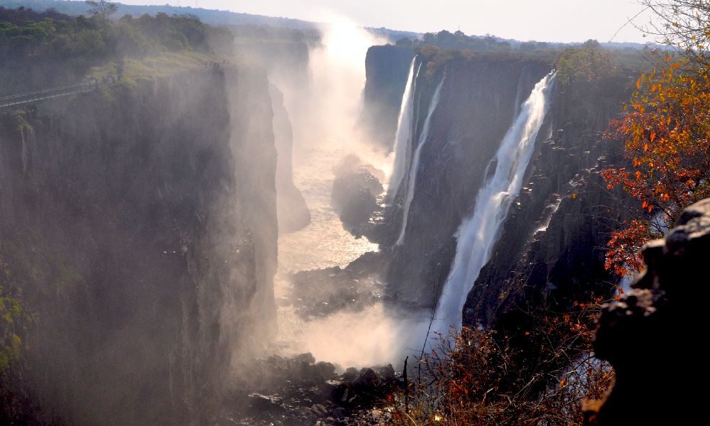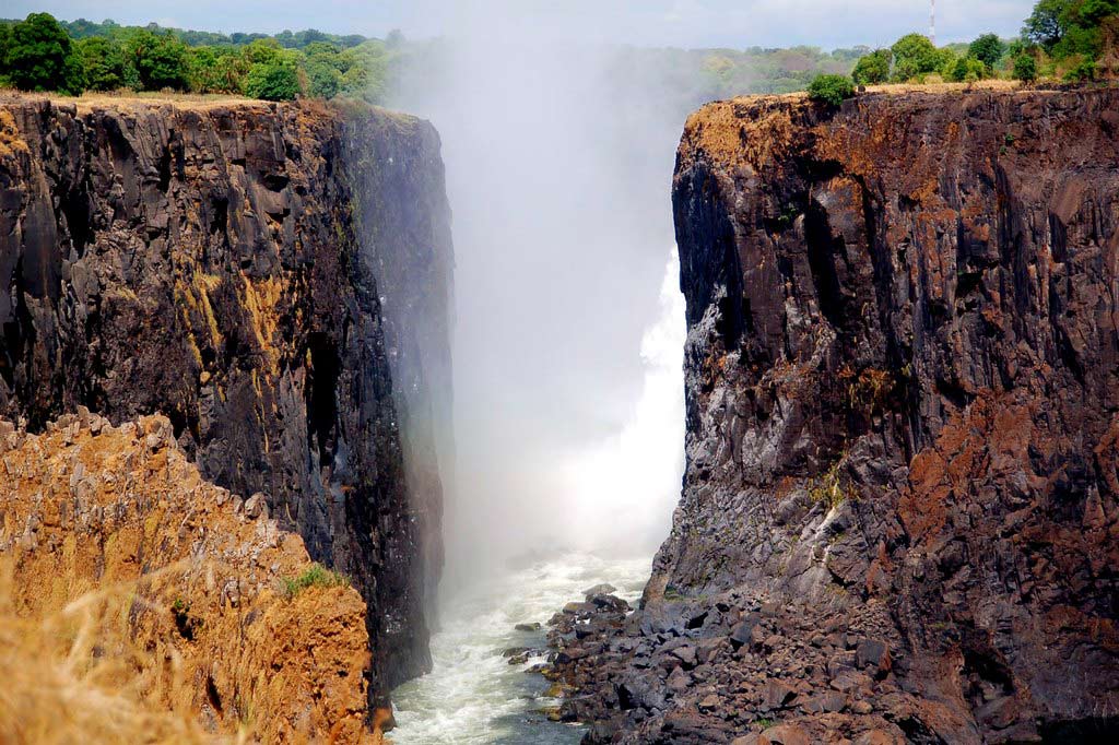 Низвергающийся, гудящий поток воды, летящий с высоты вдвое выше Ниагарского водопада, километр в длинну, пропускающий через свое жерло 750 миллинов литров в минуту — все это Водопад Виктория (Victoria Falls) в Зимбабве. Он создает такой туман из брызг, что местные жители называют его «Дым, который гремит». Глубокой древностью у самого обрыва собирались шаманы и колдуны, где они совершали магические обряды и жертвоприношения.